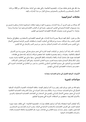 ﺔﻠﺻاﻮﻣ ﻟإ ﻊﻠﻄﺘﻧو ،يرﺎﻤﺜﺘﺳﻻاو يدﺎﺼﺘﻗﻻا ﺪﻴﻌﺼﻟا ﻠﻋ تارﺎﻣﻹا ﺔﻟوﺪﻟ ًﺎﻳرﻮﺤﻣ ًﺎﻳﺮﺷ ﺪﻨﻬﻟا ﻞﺜﻤُﺗ» :قﻮﻃ ﻦﺑ لﺎﻗو