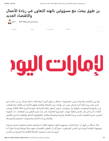 7/29/25, 2:59 PM موﯾﻟا تارﺎﻣﻹا رﺎﺑﺧأ | دﯾدﺟﻟا دﺎﺻﺗﻗﻻاو لﺎﻣﻋﻷا ةدﺎﯾر ﻲﻓ نوﺎﻌﺗﻟا دﻧﮭﻟﺎﺑ نﯾﻟوؤﺳﻣ ﻊﻣ ثﺣﺑﯾ قوط نﺑ