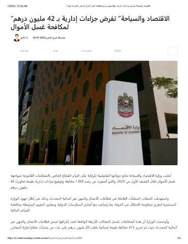 7/29/25, 10:52 AM "موﯾﻟا تارﺎﻣﻹا رﺎﺑﺧأ | لاوﻣﻷا لﺳﻏ ﺔﺣﻓﺎﻛﻣﻟ مھرد نوﯾﻠﻣ 42 ـﺑ ﺔﯾرادإ تاءازﺟ ضرﻔﺗ "ﺔﺣﺎﯾﺳﻟاو دﺎﺻﺗﻗﻻا