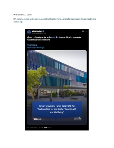 Publication: X - Wam Link: Wam: Ajman University ranks 1st in UAE for ‘Partnerships for the Goals’, ‘Good Health and Wellbeing’'