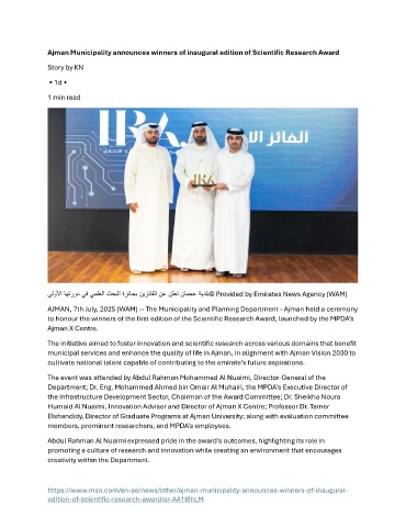 Ajman Municipality announces winners of inaugural edition of Scientific Research Award