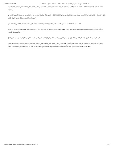 ﻮھ ةﺪﺋاﺮﻟا ﺔﯿﻤﯾدﺎﻛﻷا تﺎﺴﺳﺆﻤﻟا ﻦﯿﺑ نوﺎﻌﺘﻟا نأ ًاﺪﻛﺆﻣ ﻲﻤﻠﻌﻟا ﺚﺤﺒﻟاو ﻲﻟﺎﻌﻟا ﻢﯿﻠﻌﺘﻟا ﺮﯾﻮﻄﺘﻟ ﺔﻛﺮﺘﺸﻤﻟا ﺎﻨﯿﻋﺎﺴﻣ ﻲﻓ لﻮﺤﺗ ﺔﻄﻘﻧ نﺎﻤﺠﻋ ﺔﻌﻣﺎﺟ ﻊﻣ مﻮﯿﻟا ﺎھﺎﻨﻌﻗو ﻲﺘﻟا ﻢھﺎﻔﺘﻟا ةﺮﻛﺬﻣ ﺪﻌﺗ“ : لﺎﻗو