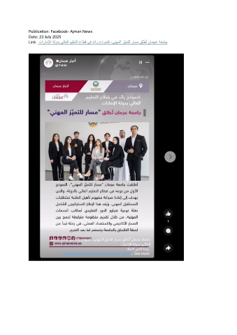 Publication: Facebook- Ajman News Date: 23 July 2025 Link: تاراملإا ةلودب يلاعلا ميلعتلا عاطق يف دئار جذومنك ،ينهملا زّيمتلل راسم قلطُت نامجع ةعماج
