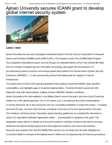 https://gulftime.ae/ajman-university-secures-icann-grant-to-develop-global-internet-security-system/ 1/2