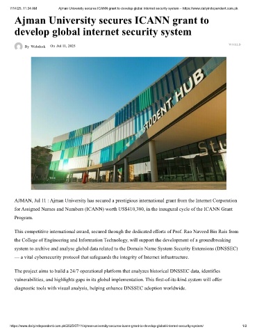 https://www.dailyindependent.com.pk/2025/07/11/ajman-university-secures-icann-grant-to-develop-global-internet-security-system/ 1/2