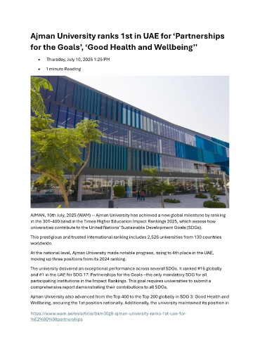 AJMAN, 10th July, 2025 (WAM) -- Ajman University has achieved a new global milestone by ranking