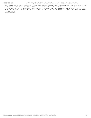 سﻠﺟﻣﻟا ﻲﻓ ةرﺎﻣﻹا ﻲﻠﺛﻣﻣ نﻣ %50 نﻋ ةرﺎﻣﻺﻟ ءﺎﺳﻧﻟا لﯾﺛﻣﺗ ﺔﺑﺳﻧ لﻘﺗ ﻻﺄﺑ ﻰﺿﻗ يذﻟاو ،2019 ﺔﻧﺳﻟ (1) مﻗر ﺔﻟودﻟا سﯾﺋر رارﻗ بﺟوﻣﺑ