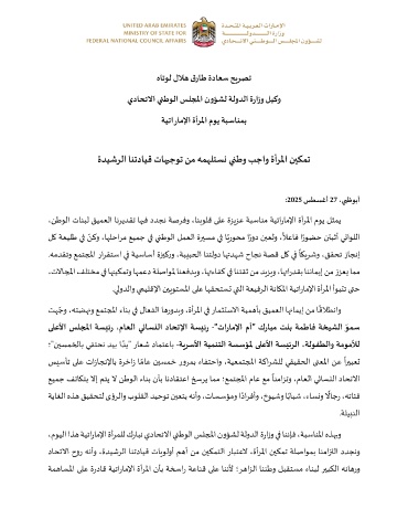 ، مويلا اذه ةيتاراملإا ةأرملل كرابن يداحتلاا ينطولا سلجلما نوؤشل ةلودلا ةرازو يف اننإف ،ةبسانلما هذهب و