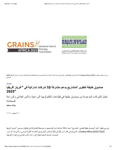 2025 ﺎﯾﻘﯾرﻓأ زﻧﯾرﻏ" ضرﻌﻣ تﺎﯾﻟﺎﻌﻓ ﻲﻓ ﺔﻛرﺎﺷﻣﻠﻟ ﺔطﺳوﺗﻣو ةرﯾﻐﺻ ﺔﯾﺗارﺎﻣإ تﺎﻛرﺷ 10 ـﻟ ﮫﻣﻋد "ﻊﯾرﺎﺷﻣﻟا رﯾوطﺗﻟ ﺔﻔﯾﻠﺧ قودﻧﺻ" نﻠﻋأ" (Grains Africa 2025)، نﺎﯾﺑﻟا ﻊﻣ ﺔﻘﻓرﻣ ةروﺻ