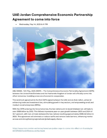 between the United Arab Emirates and the Hashemite Kingdom of Jordan will officially come into
