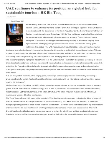 5/23/25, 9:03 AM UAE continues to enhance its position as a global hub for sustainable tourism : HE Bin Touq – Tourism Breaking News