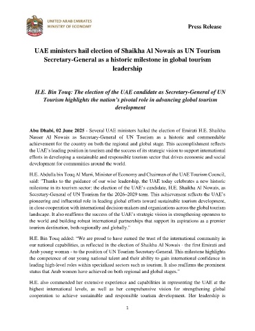 Nasser Al Nowais as Secretary-General of UN Tourism as a historic and commendable