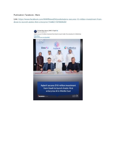 Publication: Facebook - Wam Link: https://www.facebook.com/WAMNewsEN/posts/aqlanx-secures-10-million-investment-from- doxai-to-launch-arabic-first-enterpris/1144821197680620/