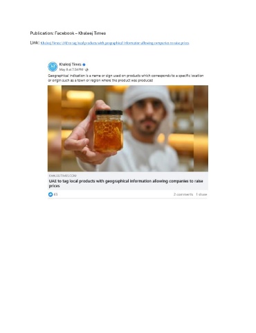 Publication: Facebook – Khaleej Times Link: Khaleej Times: UAE to tag local products with geographical information allowing companies to raise prices