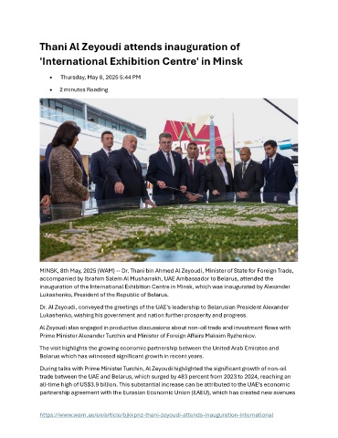 MINSK, 8th May, 2025 (WAM) -- Dr. Thani bin Ahmed Al Zeyoudi, Minister of State for Foreign Trade,