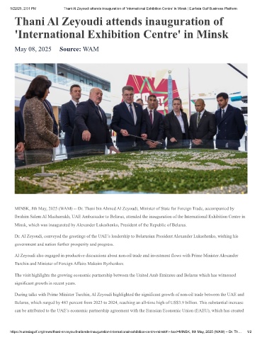 https://eurasiagulf.org/news/thani-al-zeyoudi-attends-inauguration-international-exhibition-centre-minsk#:~:text=MINSK, 8th May, 2025 (WAM) -- Dr. Th… 1/2