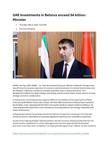 MINSK, 8th May, 2025 (WAM) -- Dr. Thani bin Ahmed Al Zeyoudi, Minister of State for Foreign Trade,