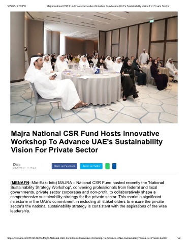 https://menafn.com/1109519277/Majra-National-CSR-Fund-Hosts-Innovative-Workshop-To-Advance-UAEs-Sustainability-Vision-For-Private-Sector 1/2
