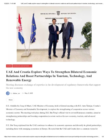5/22/25, 11:45 AM UAE and Croatia explore ways to strengthen bilateral economic relations and boost partnerships in tourism, technology, and renew…