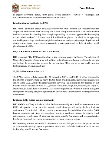 sectors in the UAE. As for bilateral investments, the UAE’s investments in Italy reached around