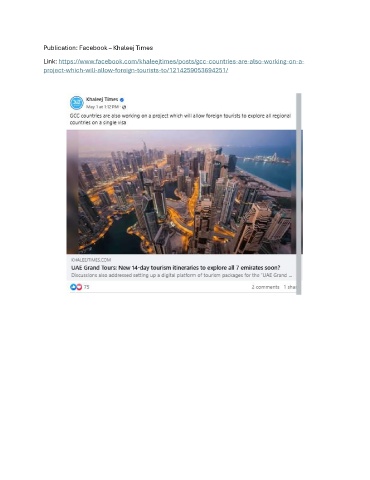 Publication: Facebook – Khaleej Times Link: https://www.facebook.com/khaleejtimes/posts/gcc-countries-are-also-working-on-a- project-which-will-allow-foreign-tourists-to/1214259053694251/