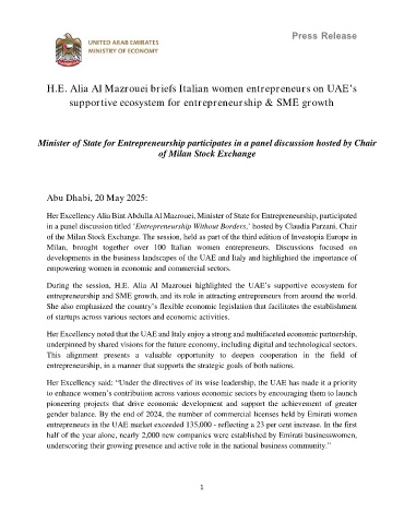 H.E. Alia Al Mazrouei briefs Italian women entrepreneurs on UAE’s