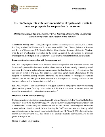 During discussions with the tourism ministers of Spain and Croatia, H.E. Bin Touq highlighted the