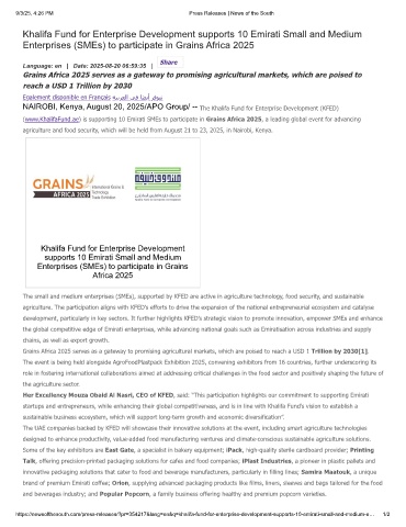 (www.KhalifaFund.ae) is supporting 10 Emirati SMEs to participate in Grains Africa 2025, a leading global event for advancing
