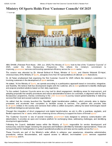 ABU DHABI, (Pakistan Point News - 25th Jun, 2025) The Ministry of Sports held its first of the “Customer Councils” of