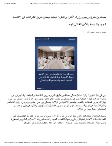 10/28/25, 8:57 AM ماو# ﻲﺋاذﻐﻟا نﻣﻷاو ﺔﺣﺎﯾﺳﻟاو دﯾدﺟﻟا دﺎﺻﺗﻗﻻا ﻲﻓ تﺎﻛارﺷﻟا زﯾزﻌﺗ نﺎﺛﺣﺑﯾ ﺔﯾدﻧﮭﻟا "شﯾدارﺑ اردﻧأ" ءارزو سﯾﺋرو قوط نﺑ ﷲدﺑﻋ | تارﺎﻣﻹا ءﺎﺑﻧأ ﺔﻟﺎﻛو