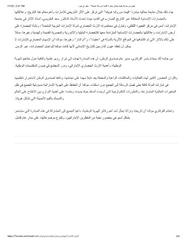 ﻰﻠﻋ ةرﺎﻀﺤﻟا ةﺄﺸﻧو ،”ةﺪﺤﺘﻤﻟا ﺔﯿﺑﺮﻌﻟا تارﺎﻣﻹا ﺔﻟوﺪﻟ يرﺎﻀﺤﻟا ثرﻹا ﮫﺗﺮﺿﺎﺤﻣ ﻲﻓ لوﺎﻨﺗو ،ﻲﻓﺎﻘﺜﻟا ةﺮﯿﺠﻔﻟا ﺰﻛﺮﻣ ﻲﻓ ﺲﻣأ ،تارﺎﻣﻹا