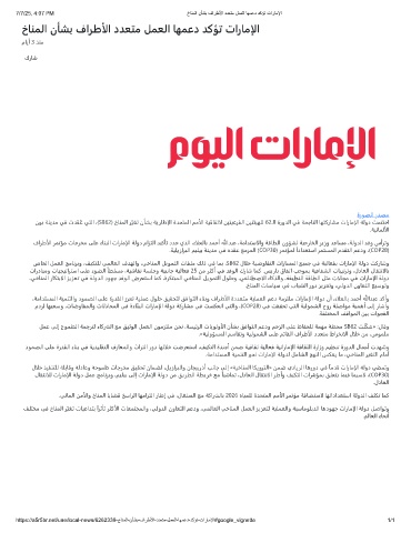 مدﺮﻟ ﺎﻬﻴﻌﺳو ،تﺎﺿوﺎﻔﻤﻟاو تﺎﺛدﺎﺤﻤﻟا ﻲﻓ ةءﺎ ّ ﻨﺒﻟا تارﺎﻣإلا ﺔﻟود ﺔﻛرﺎﺸﻣ ﻲﻓ ﺖﺴﻜﻌﻧا ﻲﺘﻟاو ،(COP28) ﻲﻓ ﺖﻘﻘﺤﺗ ﻲﺘﻟا ﺔﻴﻟﻮﻤﺸﻟا حور ﺔﻠﺻاﻮﻣ ﺔﻴﻤﻫأ ﻰﻟإ رﺎﺷأو