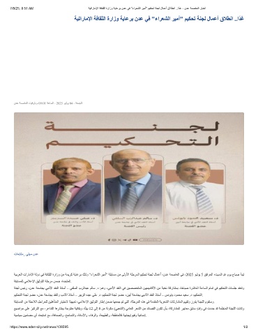 ﺔﯿﺑﺮﻌﻟا تارﺎﻣﻹا ﺔﻟود ﻲﻓ ﺔﻓﺎﻘﺜﻟا ةرازو ﻦﻣ ﺔﻤﯾﺮﻛ ﺔﯾﺎﻋﺮﺑ ﻚﻟذو "ءاﺮﻌﺸﻟا ﺮﯿﻣأ" ﺔﻘﺑﺎﺴﻣ ﻦﻣ ﻰﻟوﻷا ﺔﻠﺣﺮﻤﻟا ﻢﯿﻜﺤﺗ ﺔﻨﺠﻟ لﺎﻤﻋأ ،نﺪﻋ ﺔﻤﺻﺎﻌﻟا ﻲﻓ ،2025 ﻮﯿﻟﻮﯾ 5 ﻖﻓاﻮﻤﻟا ،ﺖﺒﺴﻟا ٍﺪﻏ مﻮﯾ حﺎﺒﺻ أﺪﺒﺗ