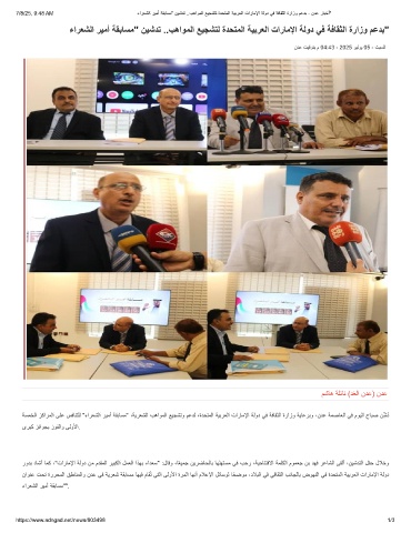 ﺔﺳﻣﺧﻟا زﻛارﻣﻟا ﻰﻠﻋ سﻓﺎﻧﺗﻠﻟ "ءارﻌﺷﻟا رﯾﻣأ ﺔﻘﺑﺎﺳﻣ" ،ﺔﯾرﻌﺷﻟا بھاوﻣﻟا ﻊﯾﺟﺷﺗو مﻋدﻟ ،ةدﺣﺗﻣﻟا ﺔﯾﺑرﻌﻟا تارﺎﻣﻹا ﺔﻟود ﻲﻓ ﺔﻓﺎﻘﺛﻟا ةرازو ﺔﯾﺎﻋرﺑو ،ندﻋ ﺔﻣﺻﺎﻌﻟا ﻲﻓ موﯾﻟا حﺎﺑﺻ نِّﺷُد