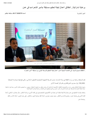 7/8/25, 9:48 AM ندﻋ ﻲﻓ «ءارﻌﺷﻟا رﯾﻣأ» ﺔﻘﺑﺎﺳﻣ مﯾﻛﺣﺗ ﺔﻧﺟﻟ لﺎﻣﻋأ قﻼطﻧا ..ﺔﯾﺗارﺎﻣإ ﺔﯾﺎﻋرﺑ