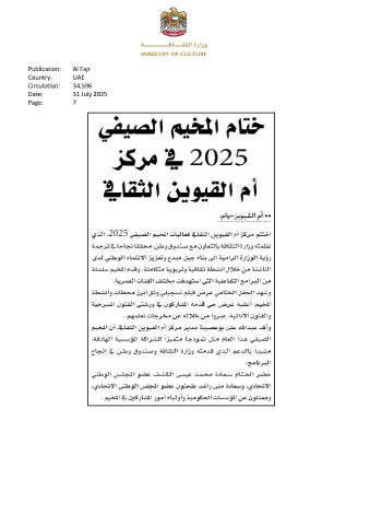 Publication: Al Fajr Country: UAE Circulation: 34,596 Date: 31 July 2025 Page: 7