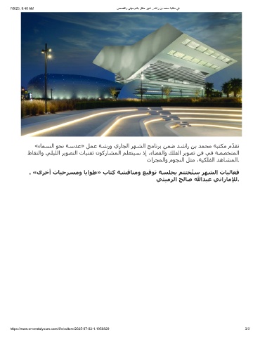 «ءﺎﻤﺴﻟا ﻮﺤﻧ ﺔﺳﺪﻋ» ﻞﻤﻋ ﺔﺷرو يرﺎﺠﻟا ﺮﮫﺸﻟا ﺞﻣﺎﻧﺮﺑ ﻦﻤﺿ ﺪﺷار ﻦﺑ ﺪﻤﺤﻣ ﺔﺒﺘﻜﻣ مّﺪﻘﺗ