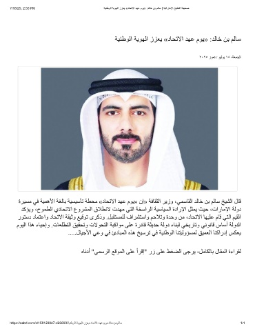 7/18/25, 2:56 PM ﺔﯾﻧطوﻟا ﺔﯾوﮭﻟا ززﻌﯾ «دﺎﺣﺗﻻا دﮭﻋ موﯾ» :دﻟﺎﺧ نﺑ مﻟﺎﺳ | ﺔﯾﺗارﺎﻣﻹا ﺞﯾﻠﺧﻟا ﺔﻔﯾﺣﺻ