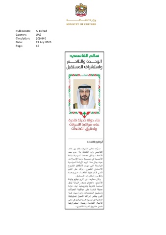 Publication: Al Etihad Country: UAE Circulation: 109,640 Date: 19 July 2025 Page: 15