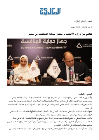ﻓ ﺔﻳرﺎﺘﺣﻻا تﺎﺳرﺎﻤﻤﻟا ﻊﻨﻣو ﺔﺴﻓﺎﻨﻤﻟا ﺔﻳﺎﻤﺣ زﺎﻬﺟ ﻊﻣ ﻢﻫﺎﻔﺗ ةﺮﻛﺬﻣ ،تارﺎﻣﻹا ﺔﻟود ﻓ دﺎﺼﺘﻗﻻا ةرازو ﺖﻌﱠﻗو
