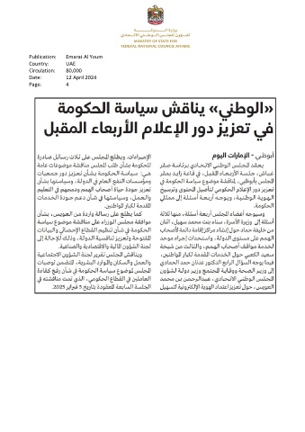 Publication: Emarat Al Youm Country: UAE Circulation: 80,000 Date: 12 April 2024 Page: 4