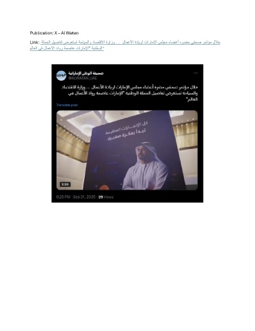 Publication: X – Al Watan Link: ةلمحلا ليصافت ضرعتست ةحايسلاو داصتقلاا ةرازو . . لامعلأا ةدايرل تاراملإا سلجم ءاضعأ هرضح يفحص رمتؤم للاخ ملاعلا يف لامعلأا داور ةمصاع تاراملإا" ةينطولا"
