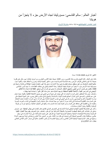 انبولق ىلع ٍلاغ مويب انرّكذيل ،ليربأ نم نورشعلاو يناثلا انيلع ّلحي« :ةفاقثلا ريزو ،يمساقلا دلاخ نب ملاس خيشلا لاق - ملاعلا ىلع ةذفان