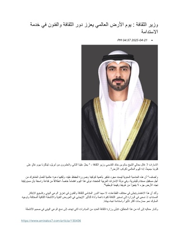 ىلع ٍلاغ مويب انرّكذيل ،ليربأ نم نورشعلاو يناثلا انيلع ّلحي " ، ةفاقثلا ريزو يمساقلا دلاخ نب ملاس خيشلا يلاعم لاق 7 - تاراملاا