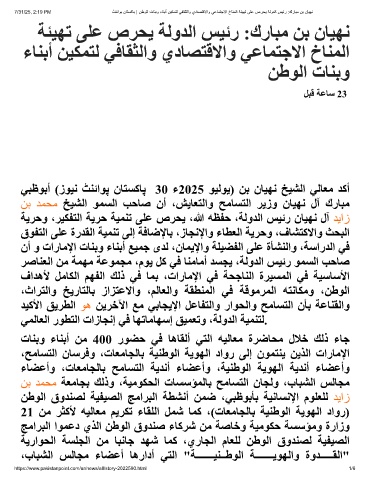 ﻲﺒظﻮﺑأ (زﻮﯿﻧ ﭧﻨﺋاﻮﭘ نﺎﺘﺴﮐﺎﭘ 30 ء2025 ﻮﯿﻟﻮﯾ) ﻦﺑ نﺎﯿﮭﻧ ﺦﯿﺸﻟا ﻲﻟﺎﻌﻣ ﺪﻛأ