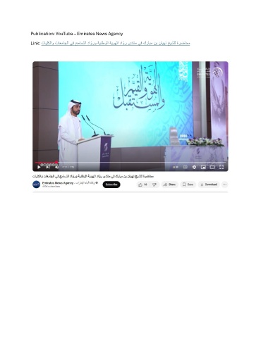Publication: YouTube – Emirates News Agency Link: تايلكلاو تاعماجلا يف حماستلا دا ّ ورو ةينطولا ةيوهلا دا ّ ور ىدتنم يف كرابم نب نايهن خيشلل ةرضاحم