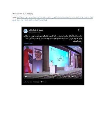 Publication: X – Al Watan Link: خانملا ةئيهت ىلع صرحي ةلودلا سيئر :كرابم نب نايهن ..يبظوبأب ةيناسنلإا مولعلل دياز نب دمحم ةعماجب اهاقلأ ةرضاحم للاخ ت نطولا تانبو ءانبأ نيكم ل يفاقثلاو يداصتقلااو يعامتجلاا