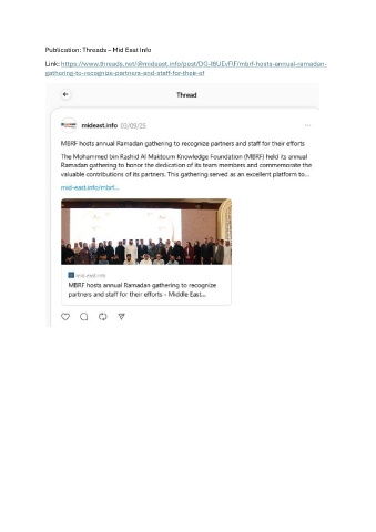 Publication: Threads – Mid East Info Link: https://www.threads.net/@mideast.info/post/DG-I6UEvFlF/mbrf-hosts-annual-ramadan- gathering-to-recognize-partners-and-staff-for-their-ef