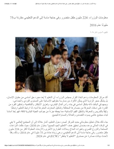 3/18/25, 11:18 AM 2016 مﺎﻋ ﺎًﻧوﯾﻠﻣ 75ب ﺔﻧرﺎﻘﻣ ﻲﻣﯾﻠﻌﺗﻟا مﻋدﻟا ﻰﻟإ ﺔﺳﺎﻣ ﺔﺟﺎﺣ ﻲﻓو ررﺿﺗﻣ لﻔط نوﯾﻠﻣ 224 :ءارزوﻟا تﺎﻣوﻠﻌﻣ | مارھﻷا ﺔﺑاوﺑ
