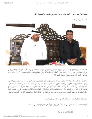 3/18/25, 11:25 AM تارﺎﺿﺣﻟاو موﻠﻌﻠﻟ ﻲﻓرﻌﻣ ءﺎﻋو «ﺔﯾﺑرﻌﻟا» :برﯾوﺣ نﺑ لﺎﻣﺟ | ﺔﯾﺗارﺎﻣﻹا ﺞﯾﻠﺧﻟا ﺔﻔﯾﺣﺻ
